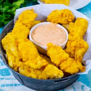 Catfish Fingers with Cajun Remoulade have a crunchy cornmeal coating that pairs really well with a creamy dip. Fried catfish is almost as southern as sweet tea and I especially love it cut into strips and deep-fried.