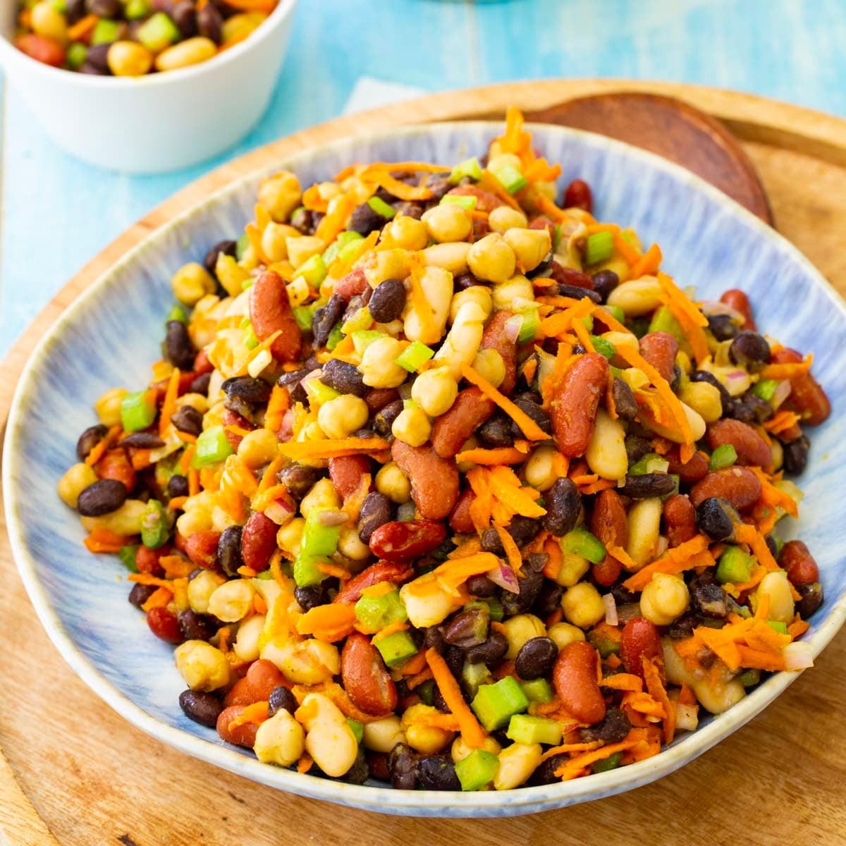 You can use any combination of beans and as many types of beans as you like. I’ve used red beans, black beans, white beans, and garbanzo beans. Pinto beans, green beans, or even black-eyed peas would also work well in this salad.