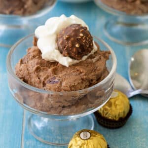 This is such a simple recipe. You only need heavy cream, sugar, mascarpone cheese, and Nutella to make the mousse. For serving I like to top it with a little Cool Whip and a Ferrero Rocher Chocolate but they are optional.