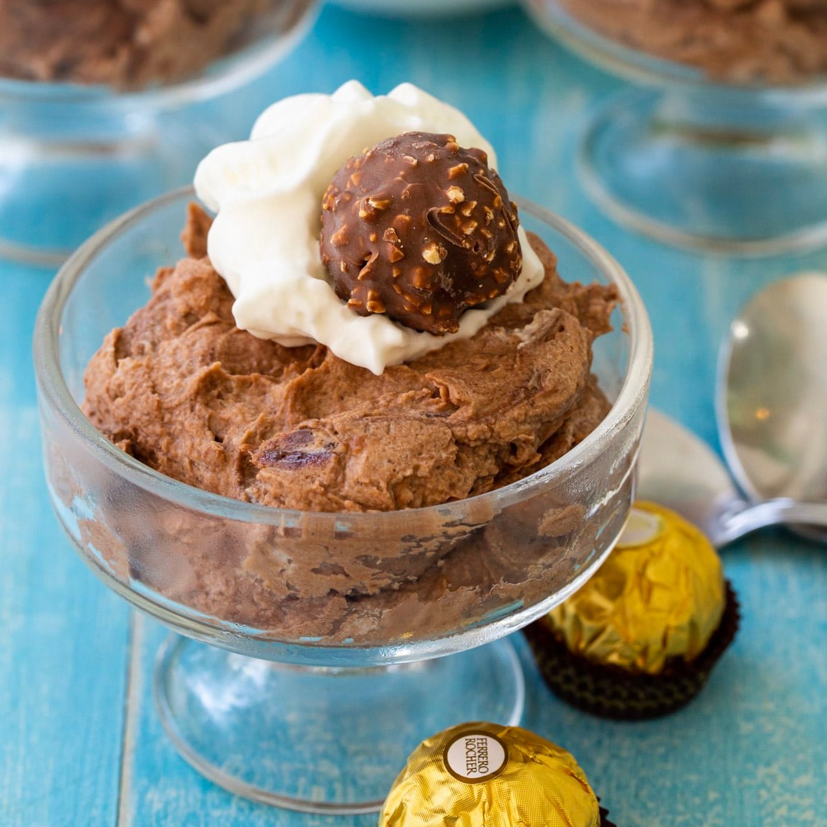 This is such a simple recipe. You only need heavy cream, sugar, mascarpone cheese, and Nutella to make the mousse. For serving I like to top it with a little Cool Whip and a Ferrero Rocher Chocolate but they are optional.